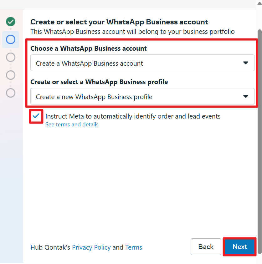 Next, you can create or select an existing WhatsApp Business account and WhatsApp Business profile. You can toggle the checkbox on the following screen to instruct Meta to automatically detect order and lead activities. After that, click “Next” to continue.