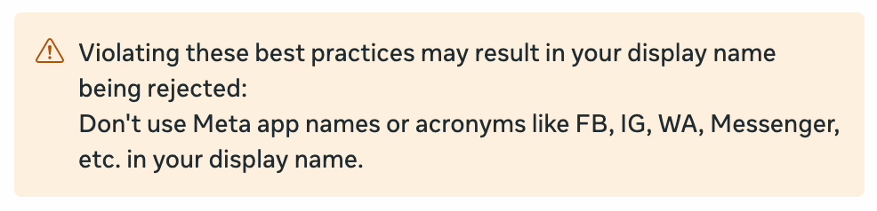 You are not allowed to use names and/or acronyms related to Meta such as FB, IG, WA, Messenger, and others in your Display Name.
