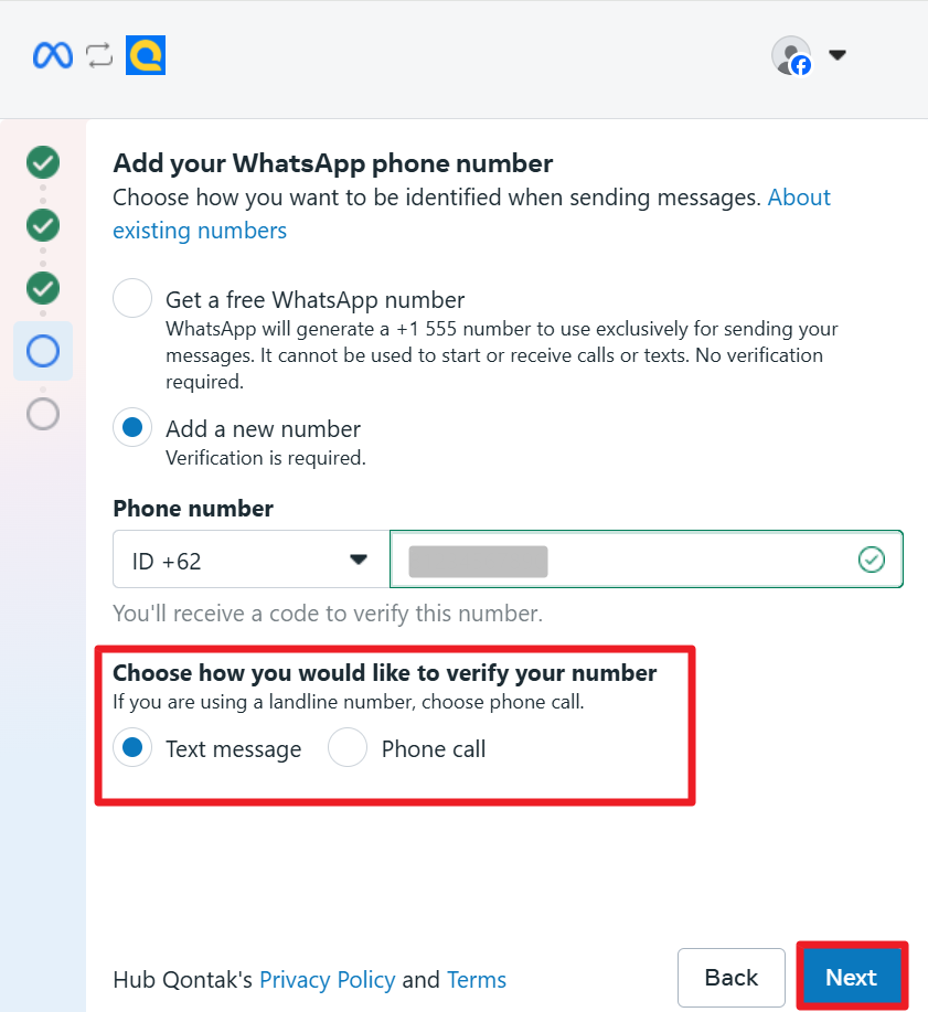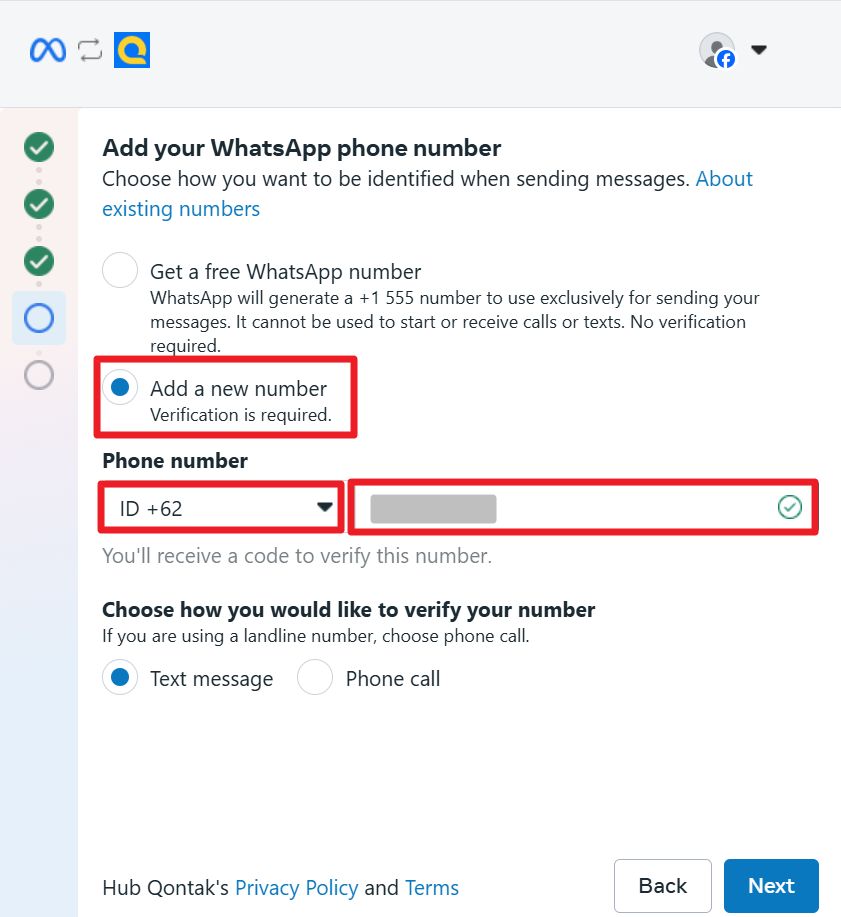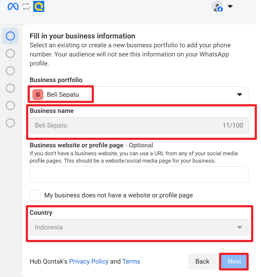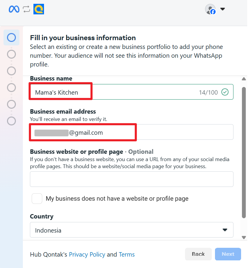 Check the checkbox below if you do not have a website or profile page. Before you can start sending messages, Qontak.com needs to verify your business. You will receive an email once this process is complete.