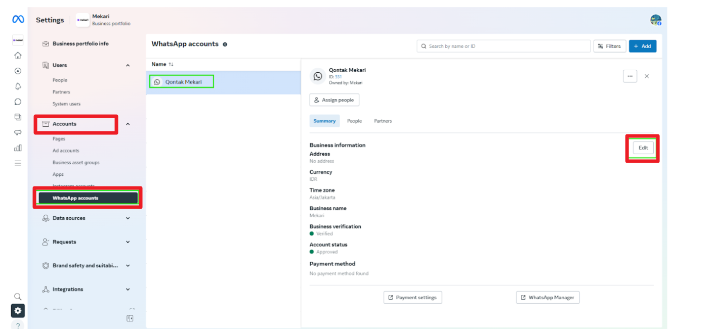 Before continuing the process of connecting the WhatsApp Business API in Qontak, you need to open a new tab and log in to your Meta Business Suite account (or visit the following link: https://business.facebook.com/latest/settings/whatsapp_account) to ensure that the Currency is set to IDR. If not, you can change the Currency via the “Settings” page, click “Accounts”, select the “WhatsApp accounts” submenu, and click “Edit” to update the selected WhatsApp account data.