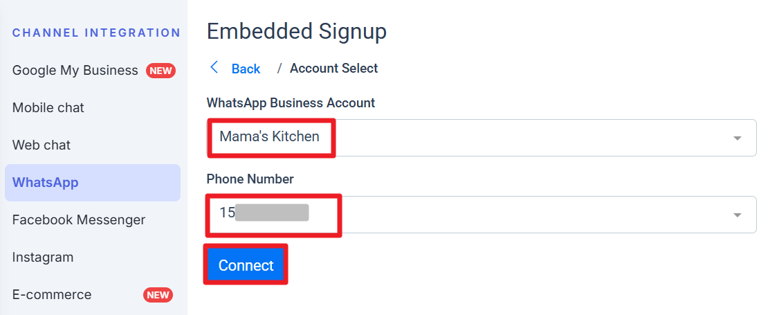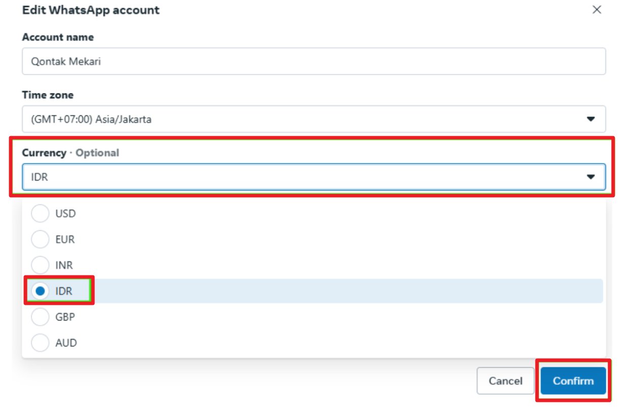 - Then, in the Currency section, select “IDR”, and click “Confirm”. - Select the WhatsApp Business Account and Phone Number that you want to use, then click “Connect” to complete the registration process.