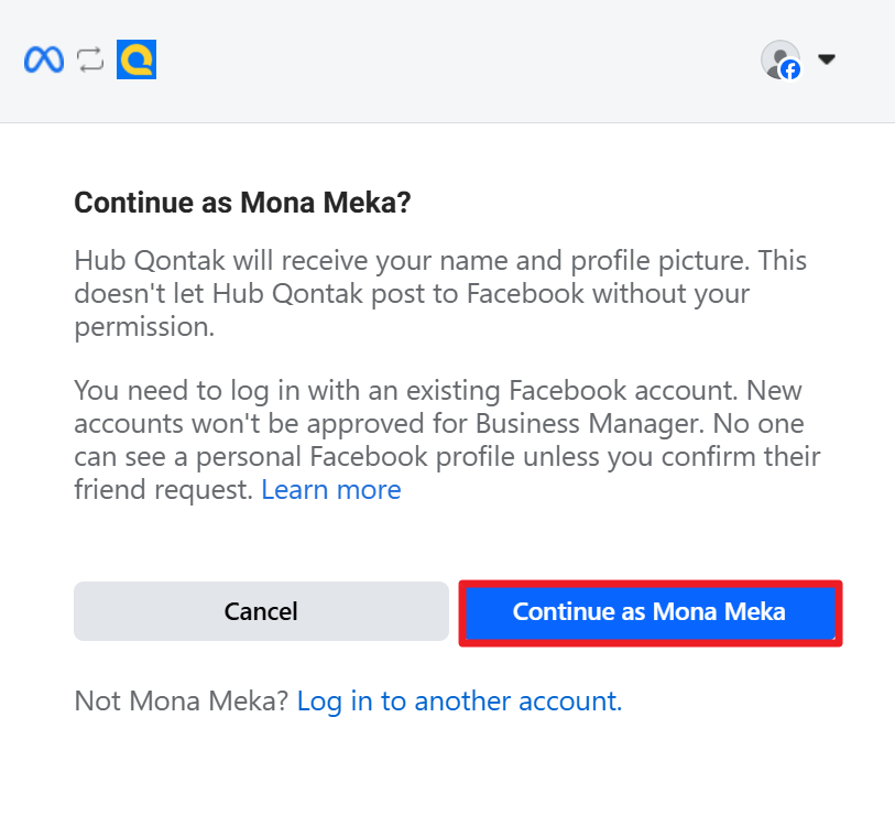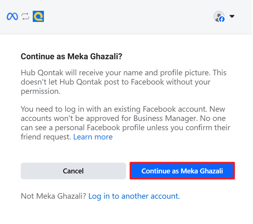 Next, a confirmation from Facebook will appear. Click “Continue as (your account name)”.