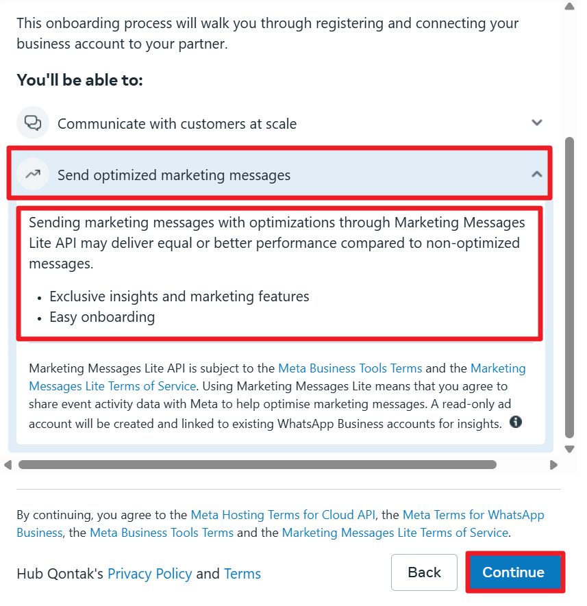 - By continuing, you agree to the terms related to Meta Hosting for Cloud API, Meta WhatsApp Business Terms, Meta Business Tools Terms, and Marketing Messages API Terms of Service.