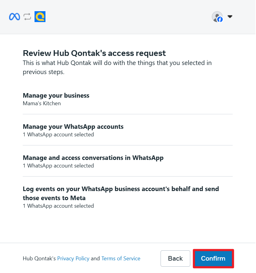 You will be directed to the next page to review a summary of the data that you will share with Qontak.com. Click “Confirm”.