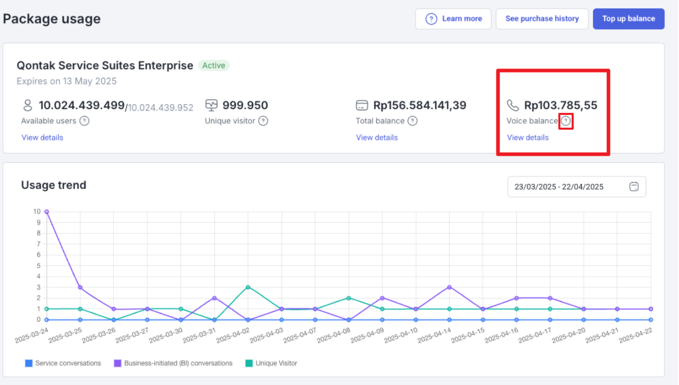 - You will then be directed to the following page. If you activate the WhatsApp Call feature, your Voice Balance quota will appear in the Package usage column. Click the "question mark" icon below to view the balance details.