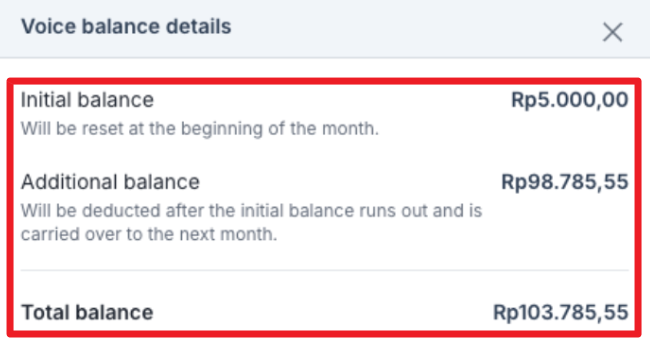 In the Voice balance details, you will see the Initial balance, Additional balance, and Total balance, or the accumulated sum of the Initial and Additional balances.