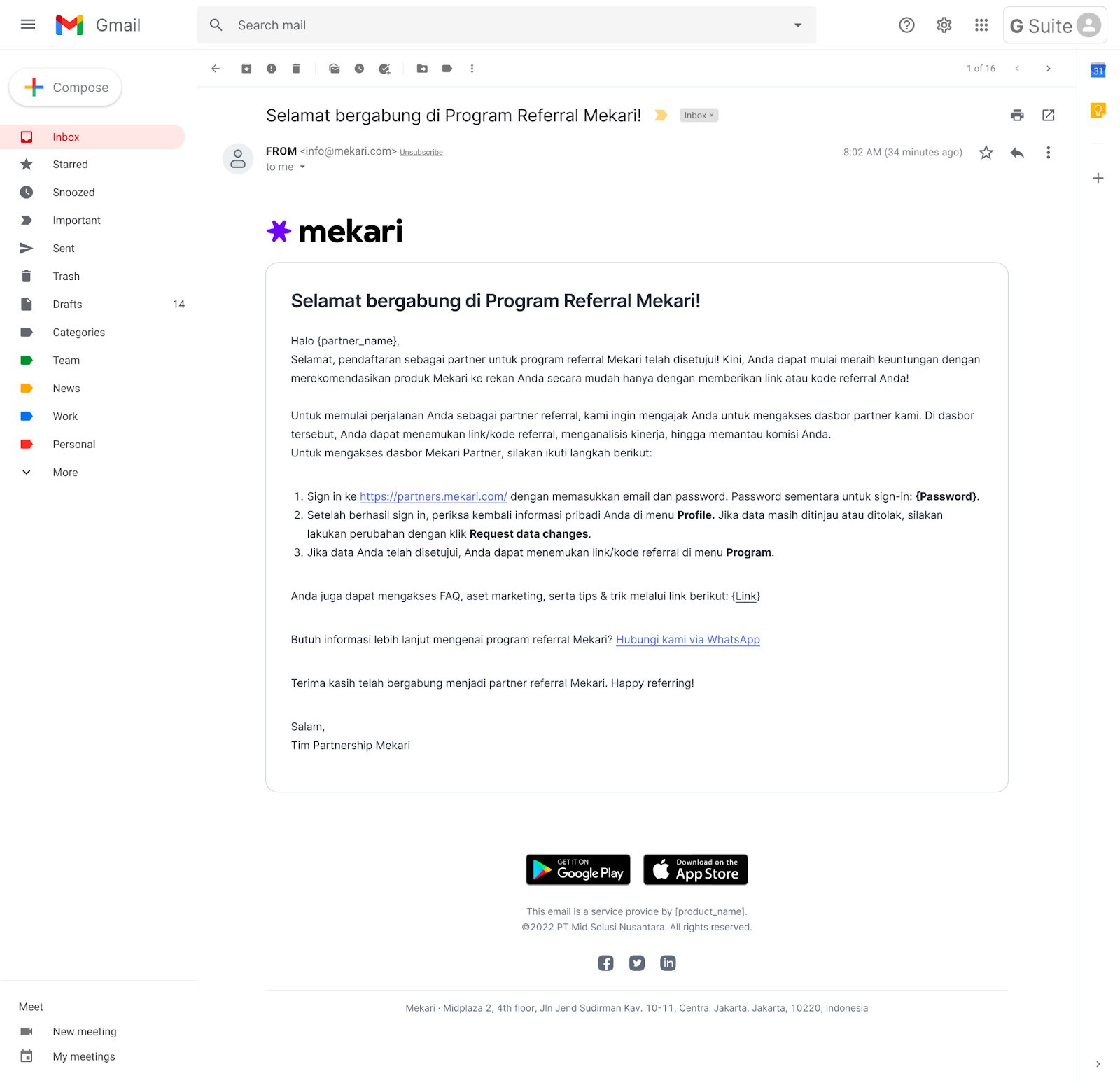 Find the email with the subject “Welcome to the Mekari Referral Program!”