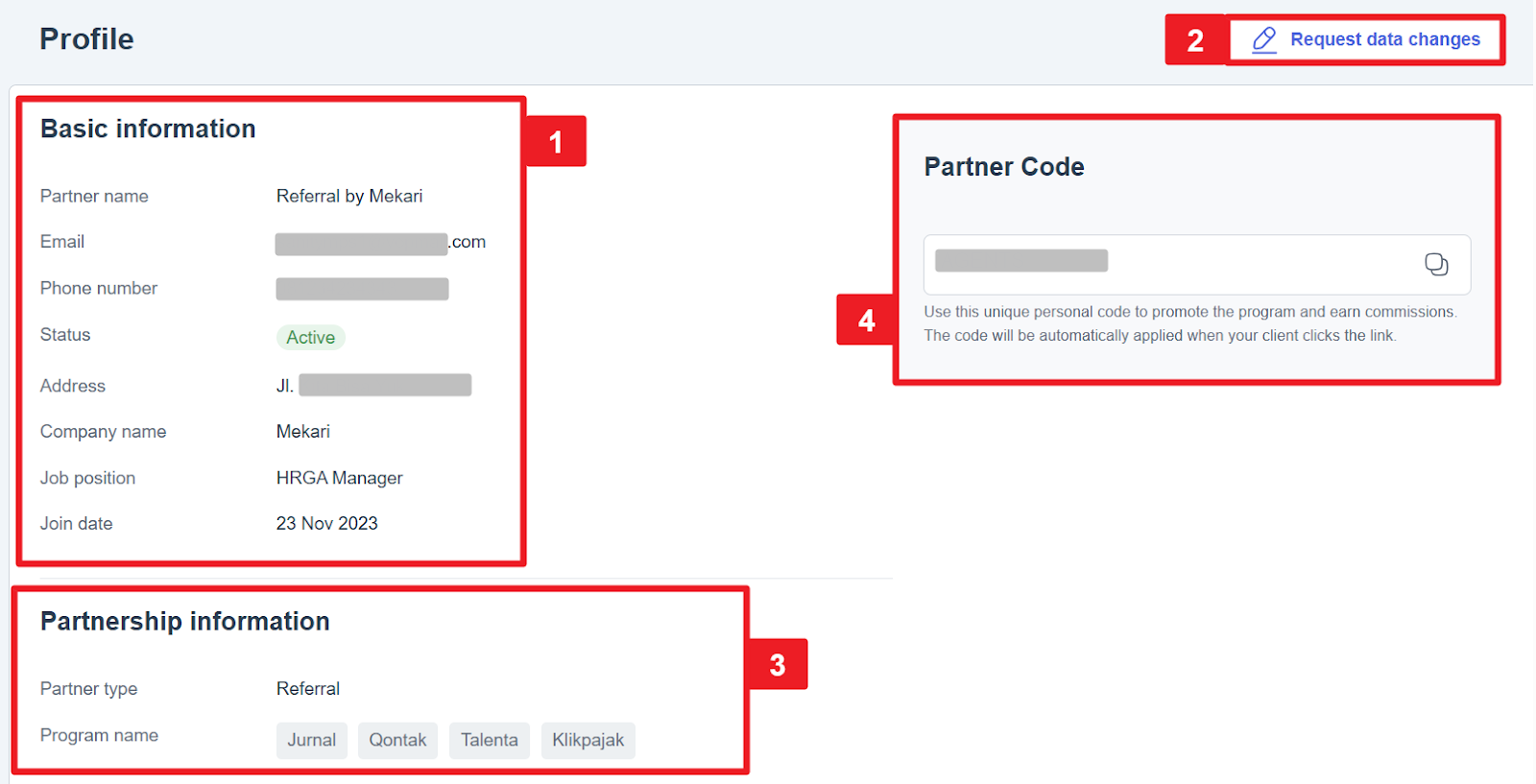 The Profile menu contains information such as your personal data, payment details, and password change options for your account. The following is an overview of the Profile menu on the Mekari Partner Platform.