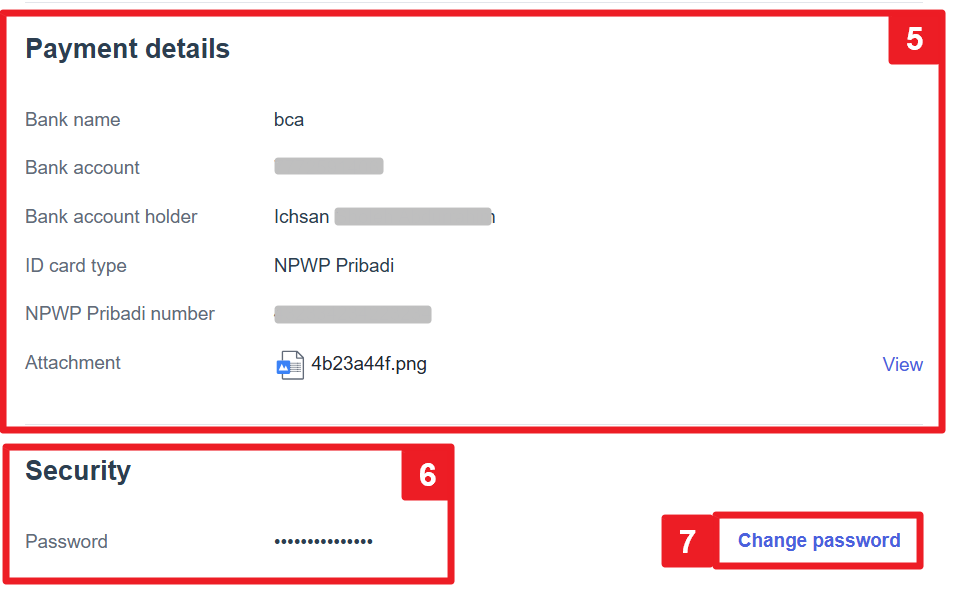 Also complete the detailed information, including the type of identification card, identification number, and a physical copy of your ID (maximum file size 1 MB). If you are an individual, use your ID card (KTP) as your identification, and if you represent a company, select the company’s tax ID (NPWP Badan). Then, fill in your account name, account number, bank name, and bank branch — the bank account information must match your identification data.