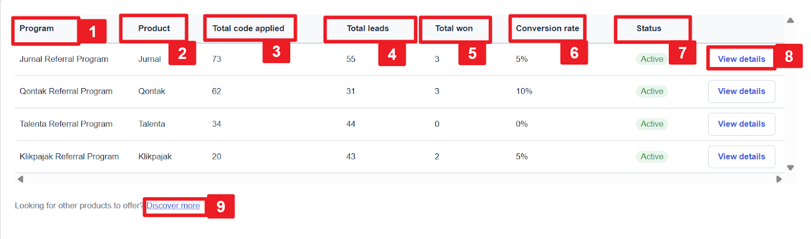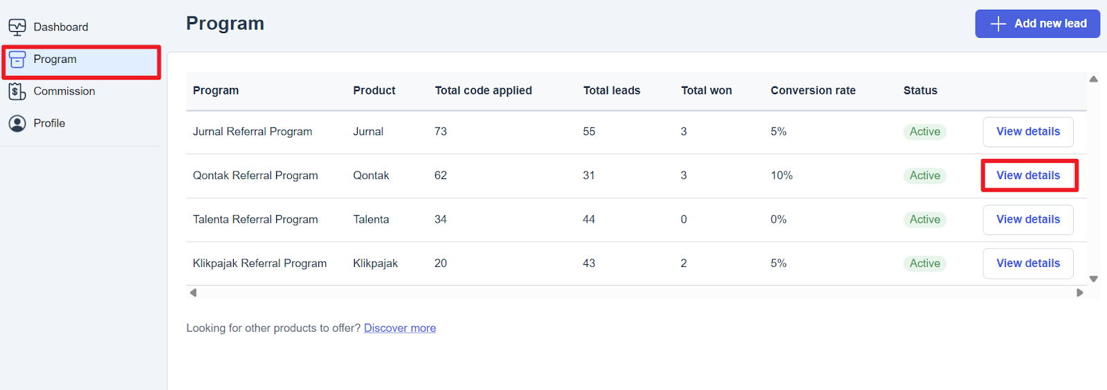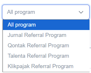 This menu displays the progress of referral programs for each Mekari product you are participating in. To access it, click Program on the left menu. You can also view detailed information for each program through the View Details button.