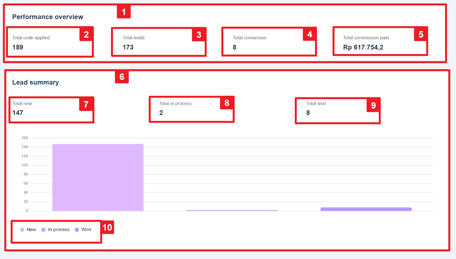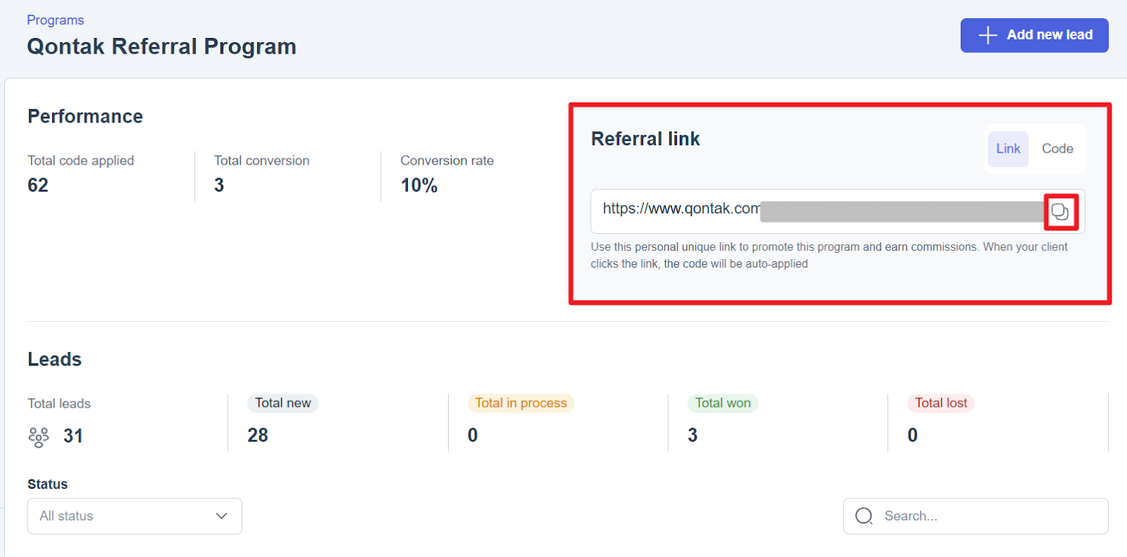 Total leads | Total number of prospects/contacts registered using your referral code. |