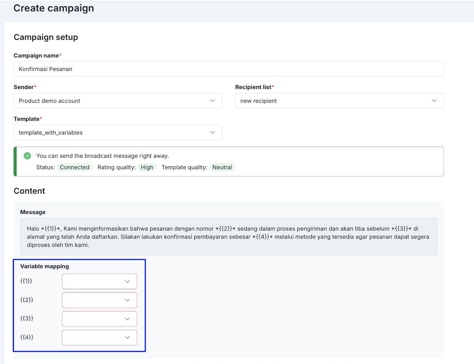 You can map variables during the campaign creation process. The variable mapping option will appear if you select a template that contains variables. Then, you can choose the header columns in the recipient lists you have selected to map to each variable.