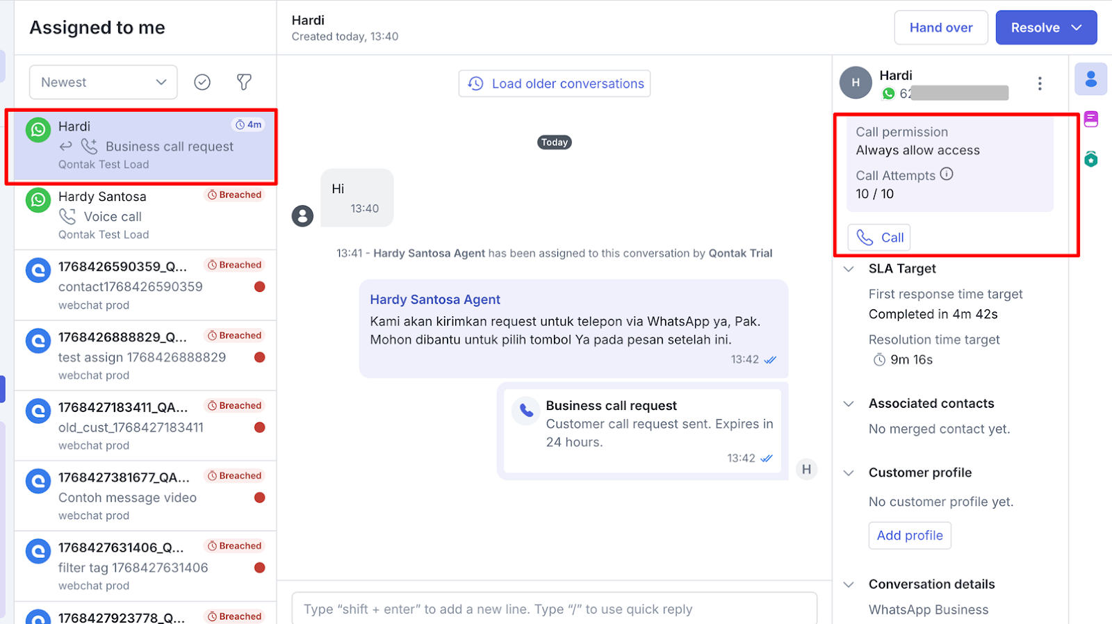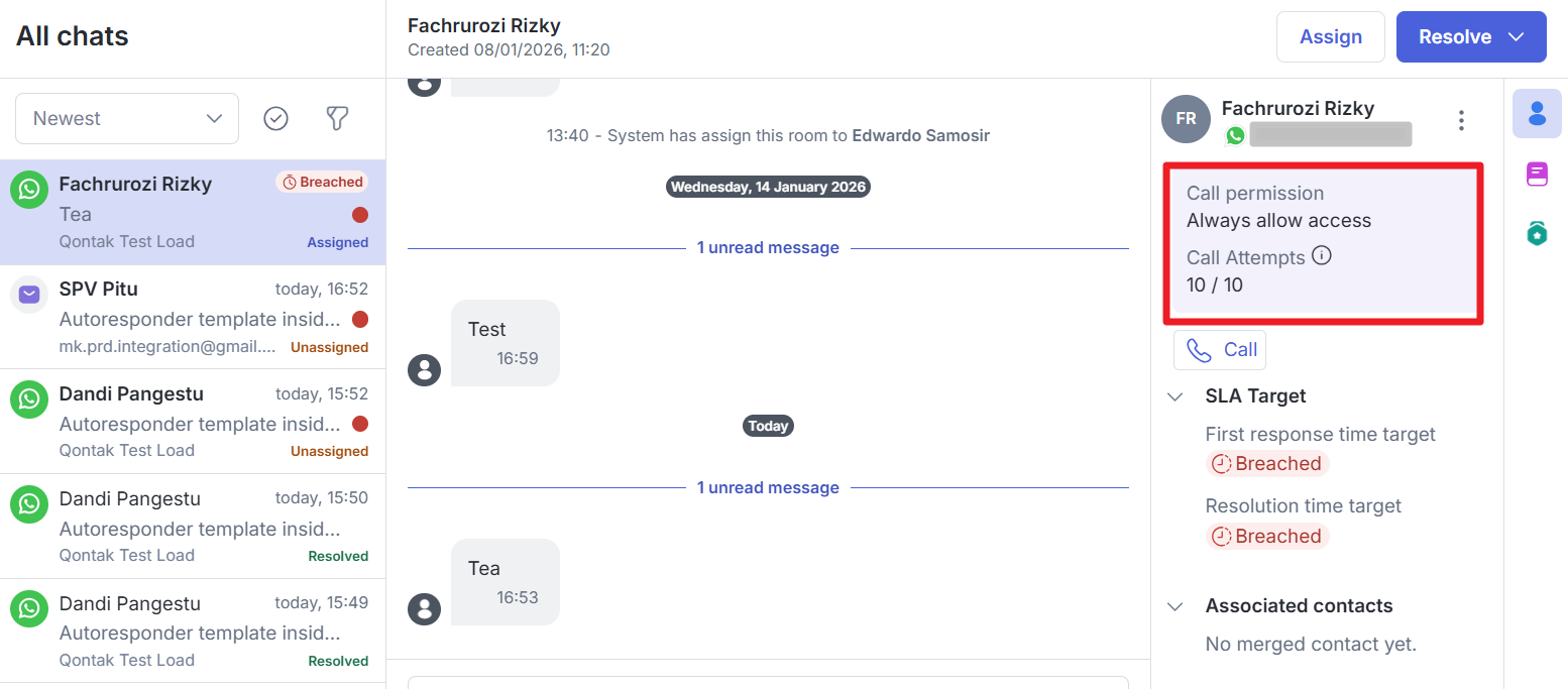 The latest version of the Qontak Chat mobile application provides full WhatsApp Call functionality for Agents.