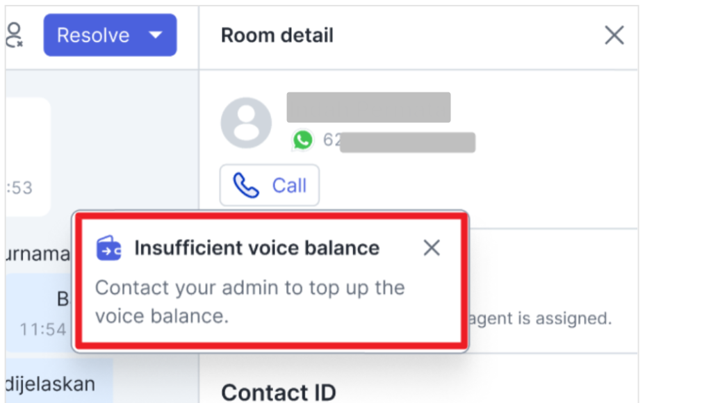 WhatsApp Call Outbound has a usage quota referred to as “Voice Balance”. Please always monitor this usage quota. If the quota is exhausted, contact your “Admin” to perform a top-up.