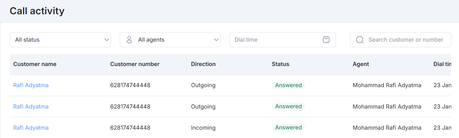 - Answered: The call is successfully connected and handled by an “Agent”.