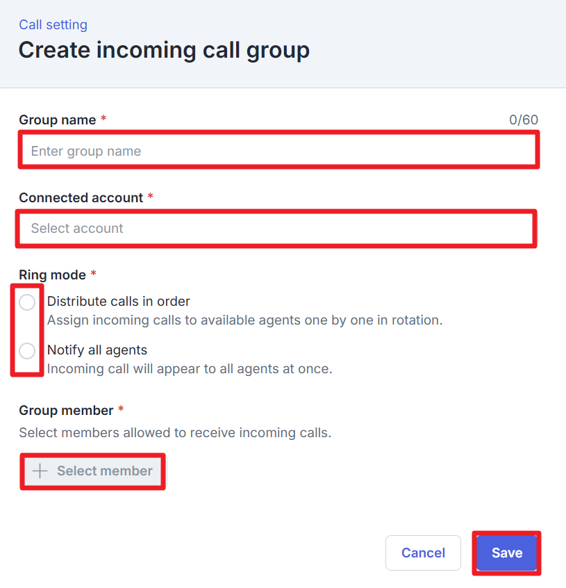 Specify the “Group Name”, “Connected Account”, “Ring Group Mode”, and “Group Member”, then click “Save”.