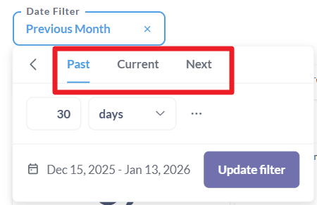 | 1 | Date filter | Pada menu Date Filter, terdapat tiga opsi periode waktu: Past, Current, dan Next. Opsi ini membantu Anda memilih rentang tanggal secara cepat berdasarkan posisi waktu terhadap hari ini. Past digunakan untuk menampilkan data pada periode yang telah berlalu. Berikut periode yang dapat Anda pilih: Current digunakan untuk menampilkan data pada periode yang sedang berlangsung saat ini. Berikut periode yang dapat Anda pilih: Next digunakan untuk menampilkan data pada periode mendatang (belum terjadi). Berikut periode yang dapat Anda pilih: |