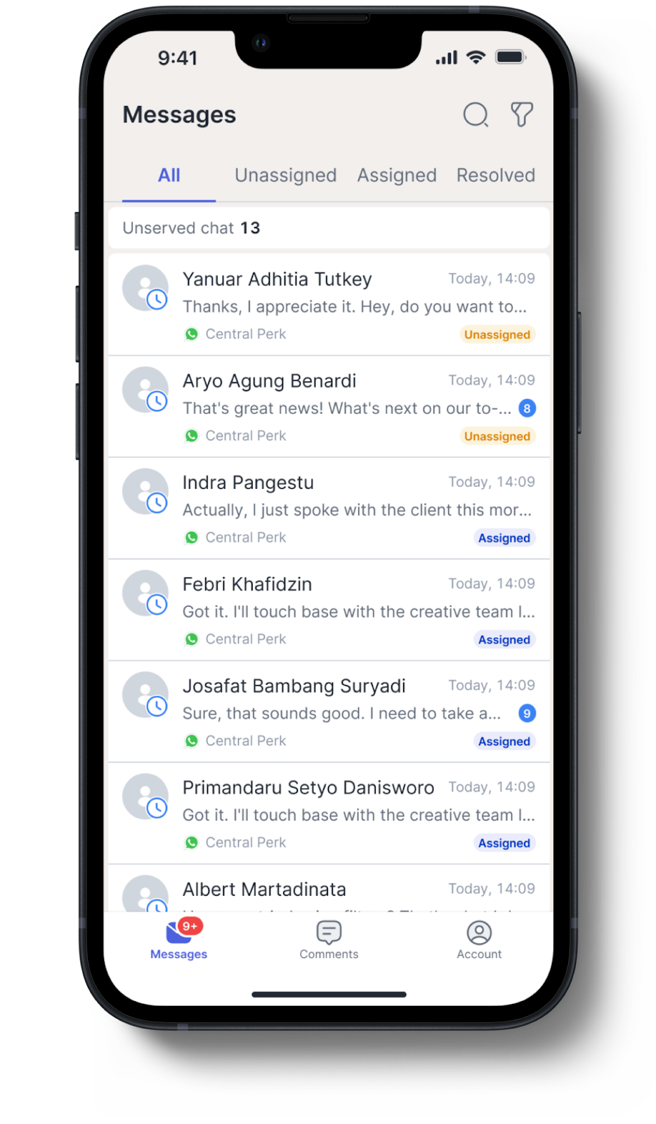 Menyediakan fitur untuk memantau status pesan, assign chat ke tim, dan memberikan respon cepat.