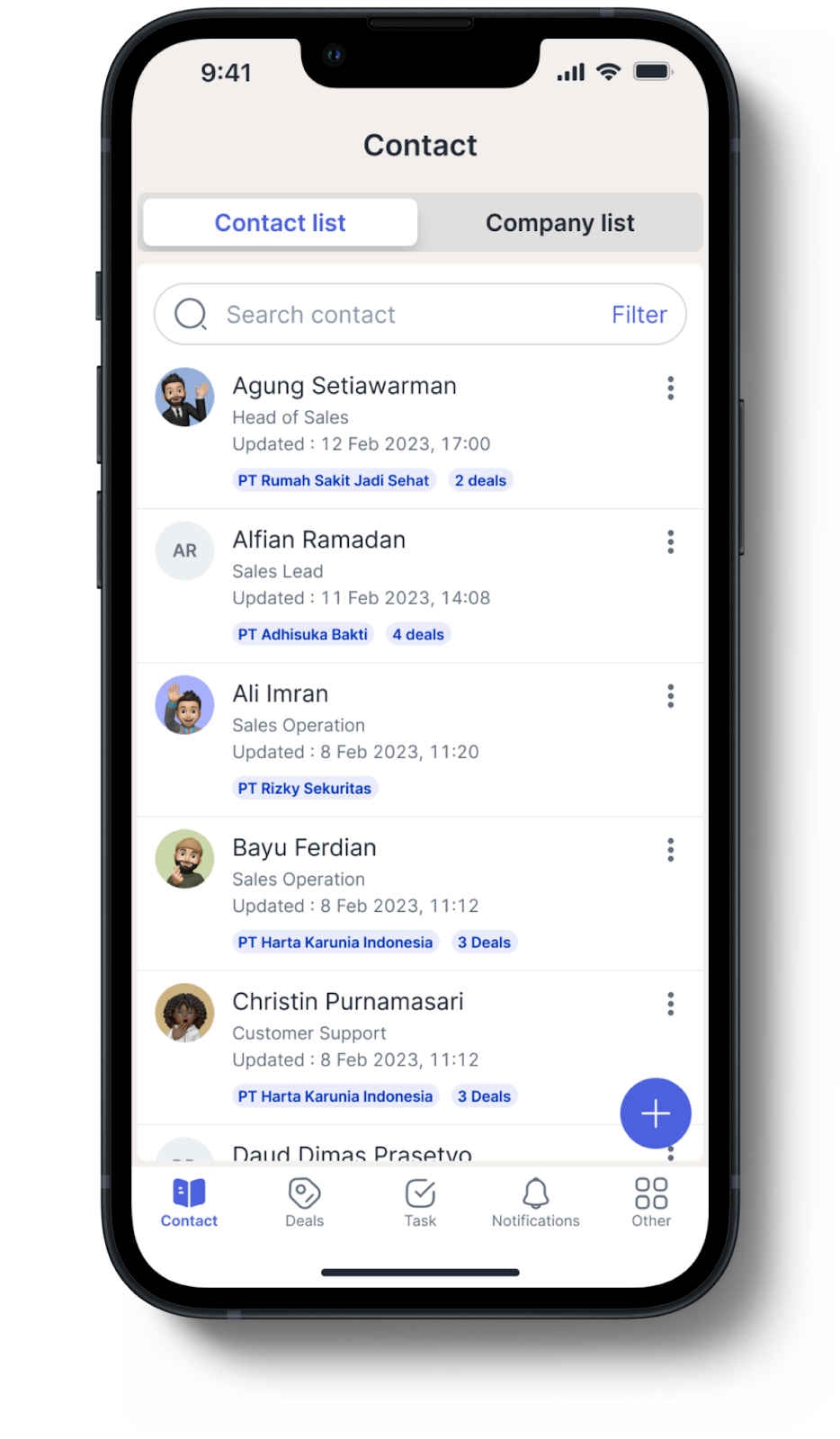 Di bawah ini merupakan sekilas tampilan Qontak CRM Mobile.