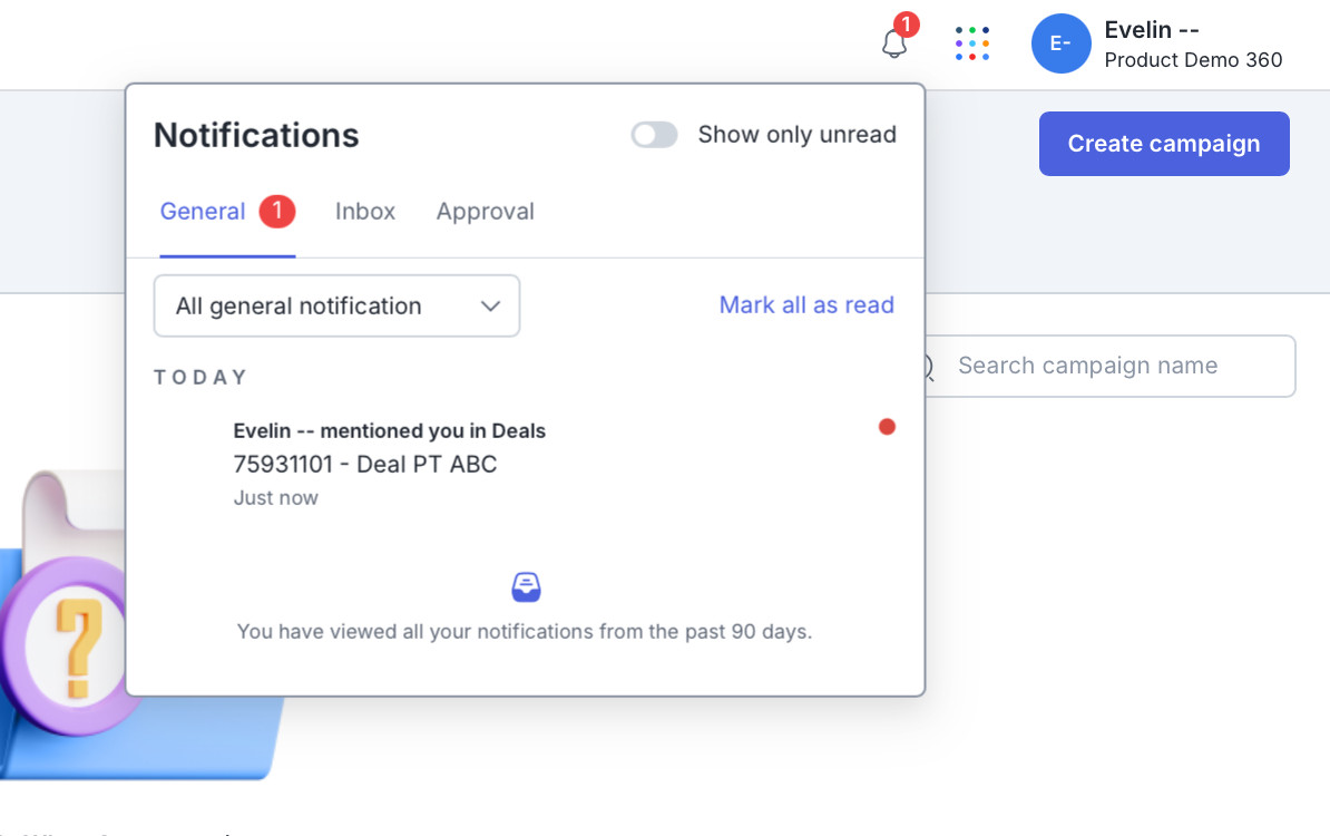 Tab notifikasi yang berisikan pemberitahuan dan permintaan approval pada Deals dan Expense. Periode retensi data Approval disimpan selama 90 hari. |