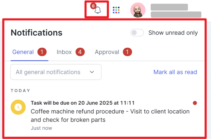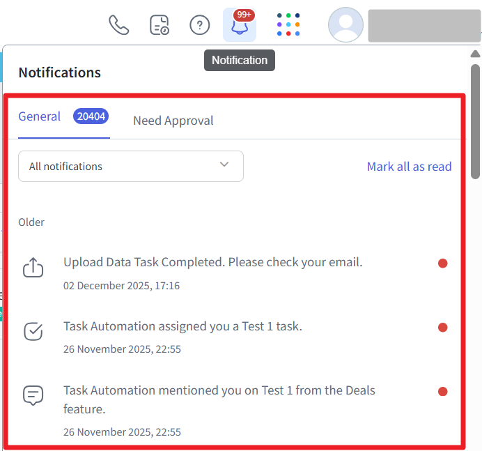 | 3 | Ikon centang | Klik ikon tersebut untuk menandai semua notifikasi pada tab dan filter yang sedang aktif sebagai dibaca. Notifikasi yang tidak masuk ke tab dan filter yang sedang Anda lihat tidak akan terdampak. |
