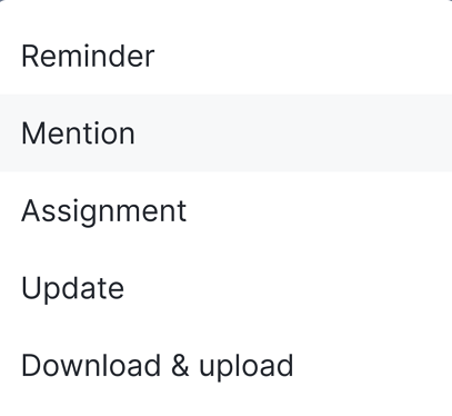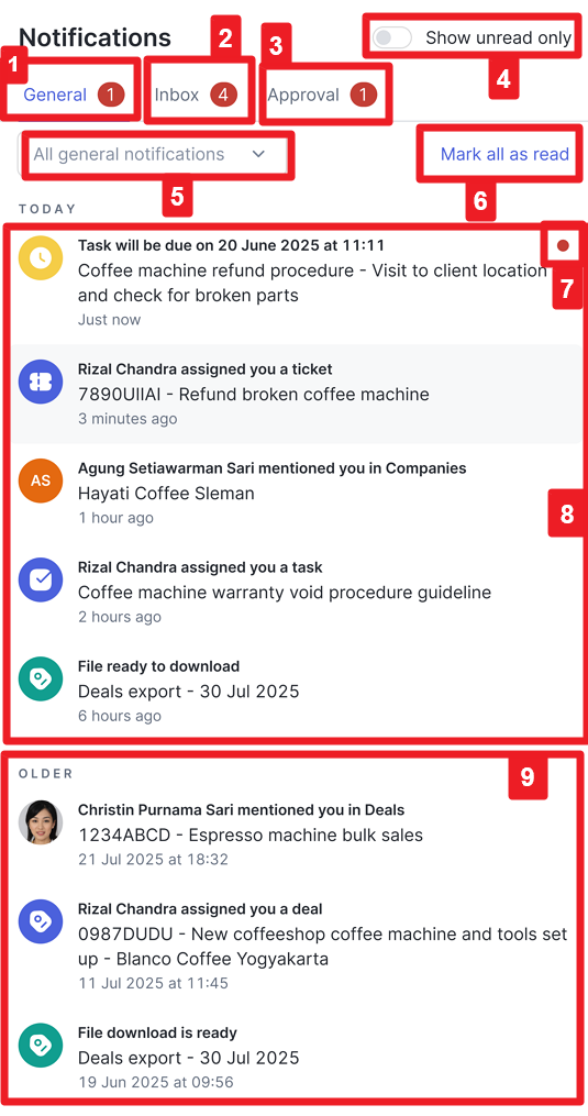 Tab notifikasi yang berisikan mention, reminder, penugasan (deal, ticket, task), perpindahan status tiket dan task, pemberitahuan proses download dan upload, serta notifikasi dari trigger fitur automated action. Periode retensi data General disimpan selama 90 hari. |