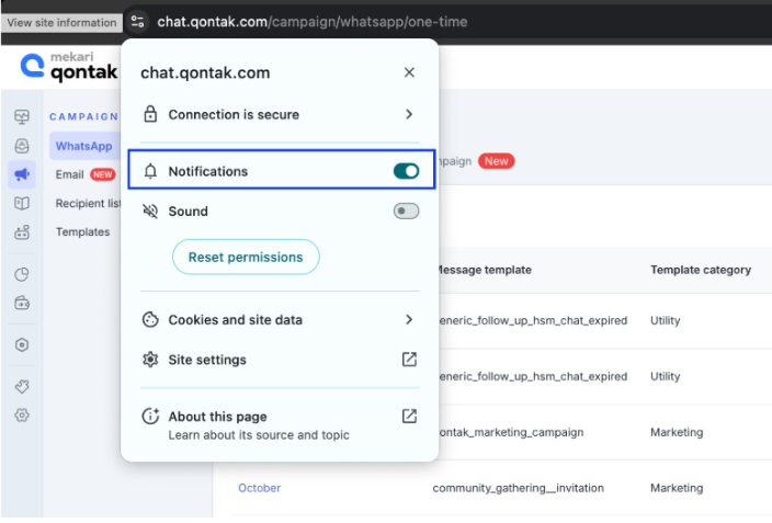 Sedangkan untuk Browser Notifications, pastikan Anda telah mengaktifkan pengaturan notifikasi pada perangkat Anda untuk Browser yang Anda gunakan pada saat login ke Qontak.