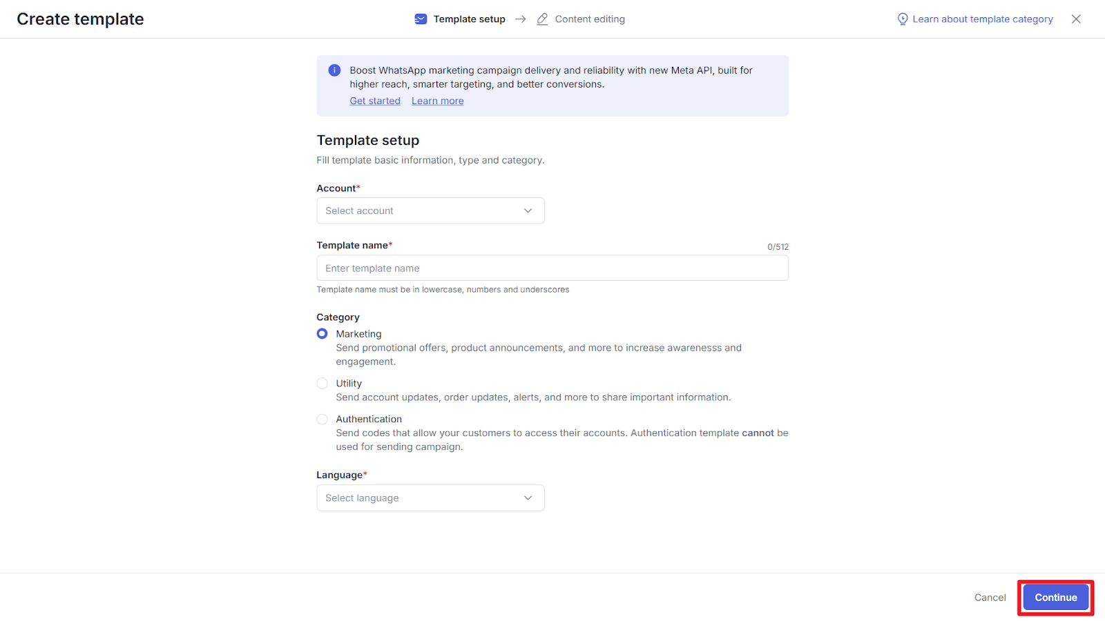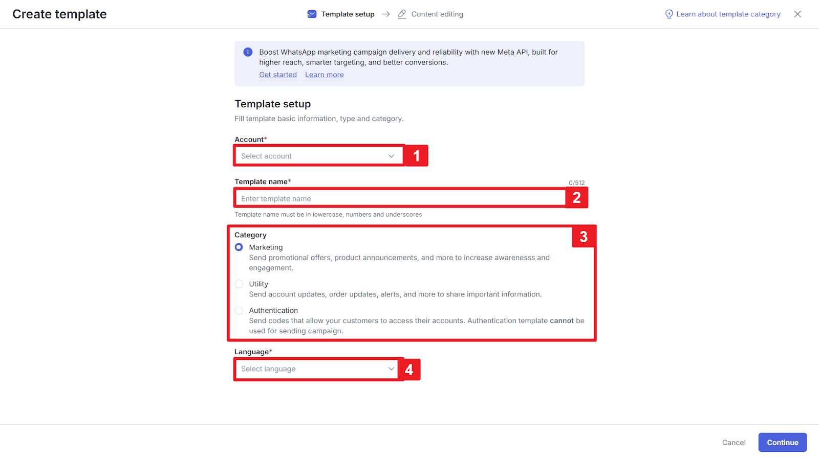 Apabila Anda memilih template dengan kategori Marketing atau Utility, maka Anda perlu mengisi informasi berikut ini.