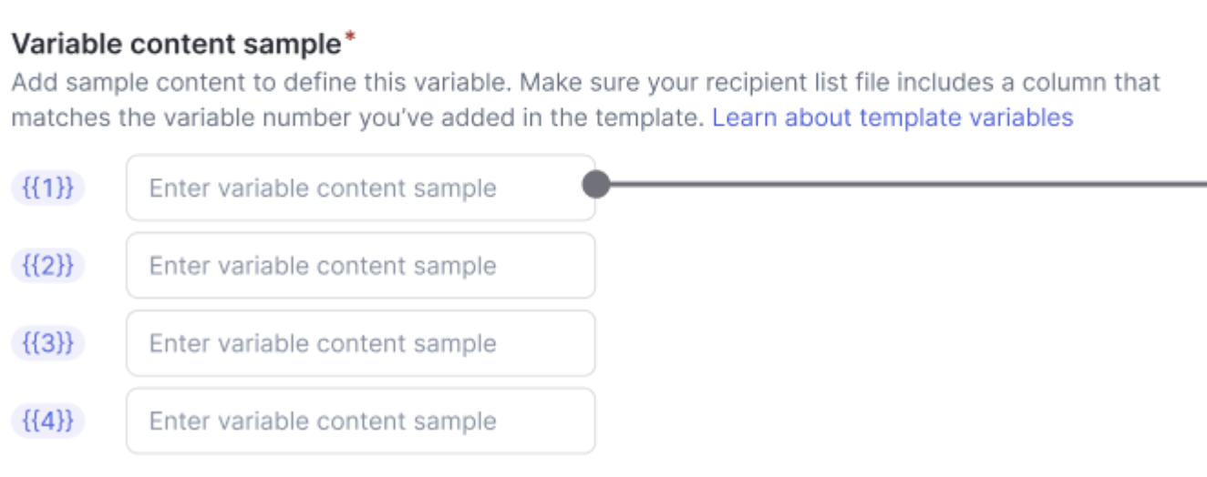 Anda dapat menggunakan variabel untuk memasukkan informasi dinamis (misal untuk informasi spesifik per customer, seperti nama customer) pada konten pesan Anda. Anda wajib mengisi contoh isi variabel untuk membuat template. - Variabel bersifat opsional. |