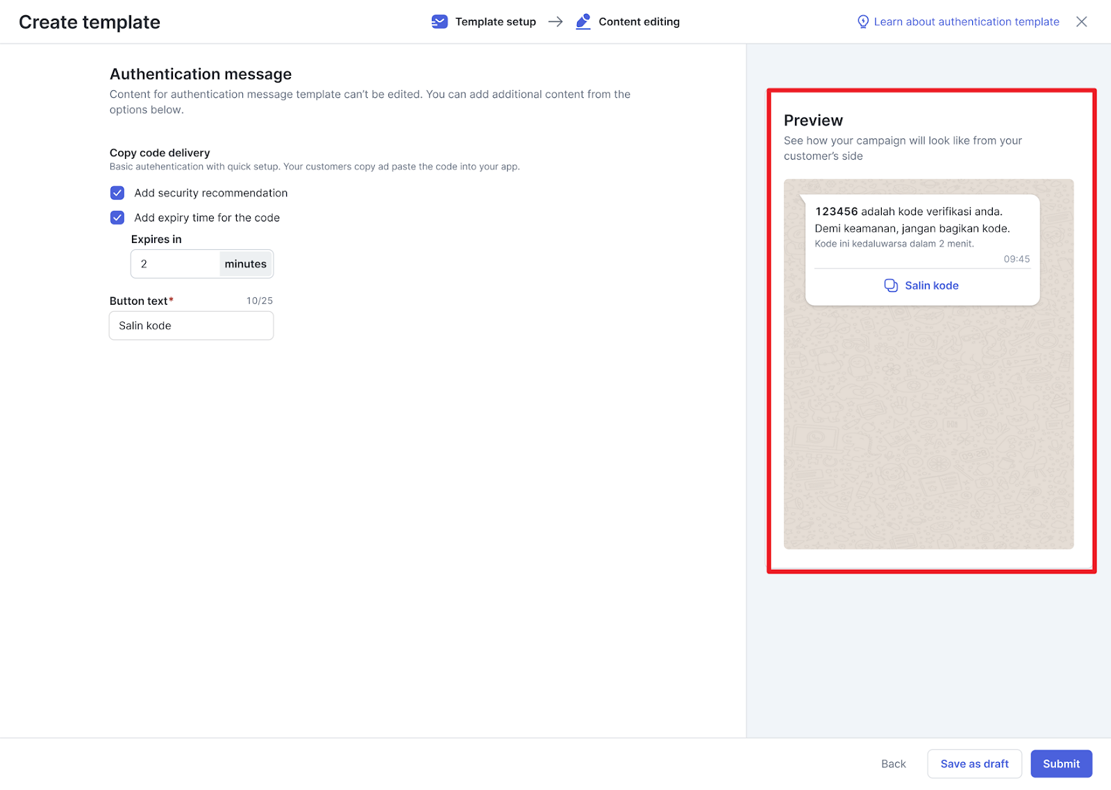 Apabila Anda memilih template dengan kategori Authentication, maka Anda perlu mengisi informasi berikut ini.