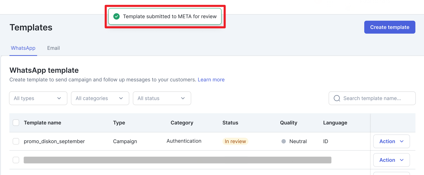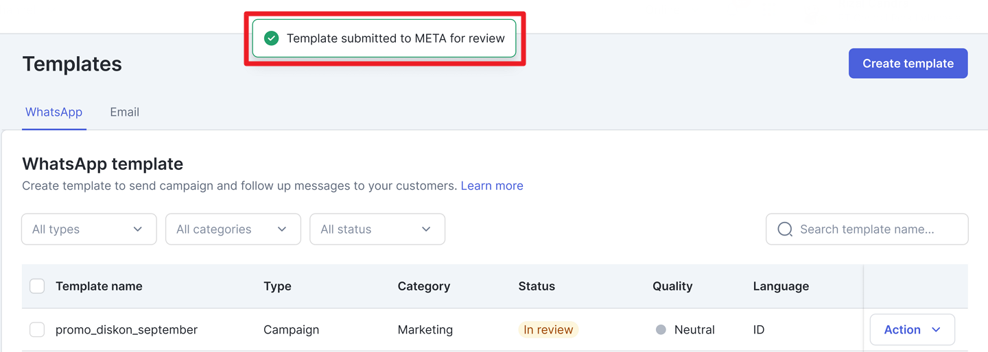 Maka template berhasil dibuat dengan status In Review dan akan dikirim ke META untuk di-review sebelum dapat digunakan untuk mengirimkan campaign. Pelajari tentang template status di sini.