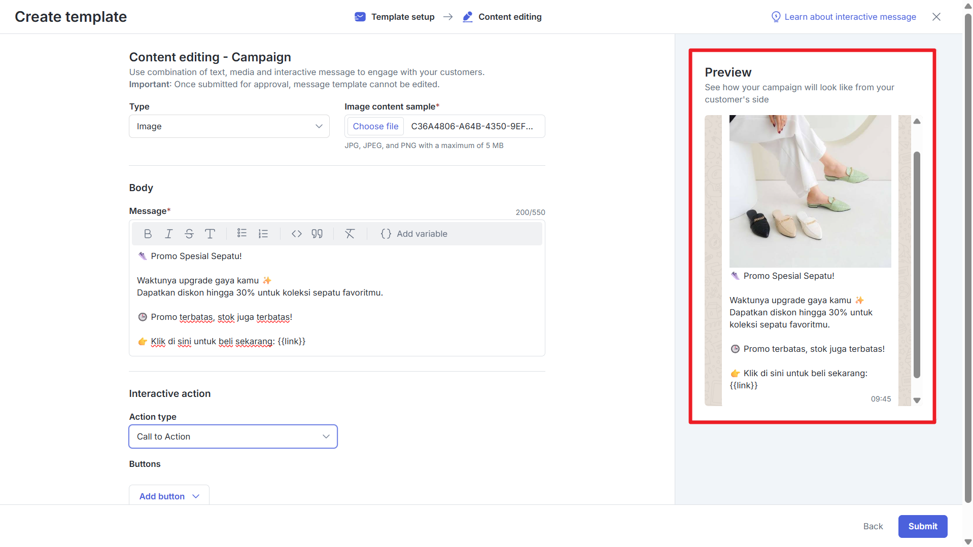 Harap untuk tidak mengubah penamaan button dikarenakan penamaan ini divalidasi oleh META. Lalu, Anda dapat melihat preview template di sisi kanan untuk memastikan tampilannya sudah sesuai sebelum mengkonfirmasi pembuatan template.