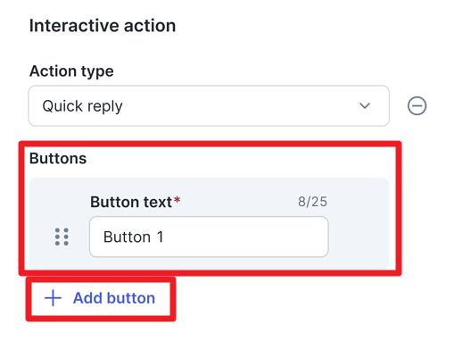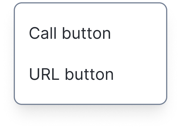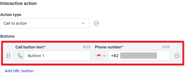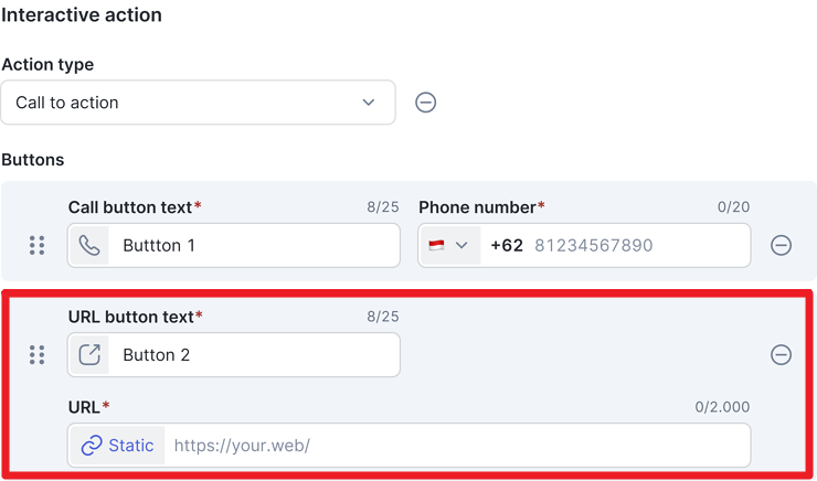 Anda dapat menambahkan tombol interaktif untuk memberikan action selanjutnya agar pelanggan mengetahui tindakan apa yang mereka dapat ambil, dengan opsi tipe: Anda hanya dapat memilih satu tipe interactive action untuk setiap template.Berikut adalah penjelasan untuk setiap tipe interactive action yang tersedia: a. Call to Action Berikut tampilan yang muncul apabila Anda memilih Call button. Silakan pilih kode negara dan isi nomor telepon bisnis Anda. Jika nomor diisi, customer yang klik Call button text akan diarahkan otomatis ke fitur phone call di mobile device mereka. Contoh URL dinamis b. Quick Reply Anda dapat mengubah nama Button text dengan opsi jawaban yang ingin diberikan ke customer. Misal: “Lihat daftar harga”, “Ya, saya tertarik”. |