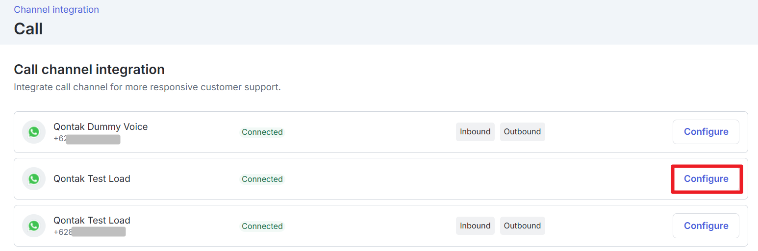 Lalu pada halaman berikut, klik “Configure” pada akun WhatsApp yang telah terintegrasi.