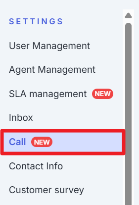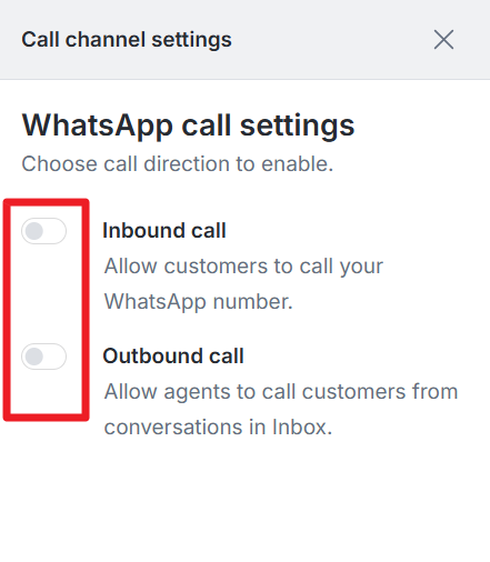 Role Admin dapat mengakses menu WhatsApp Integration Settings dan tab baru bernama “Call”. Apabila Anda merupakan peran tersebut, Anda dapat mengaktifkan inbound dan outbound call sesuai kebutuhan. Berikut langkah-langkahnya.