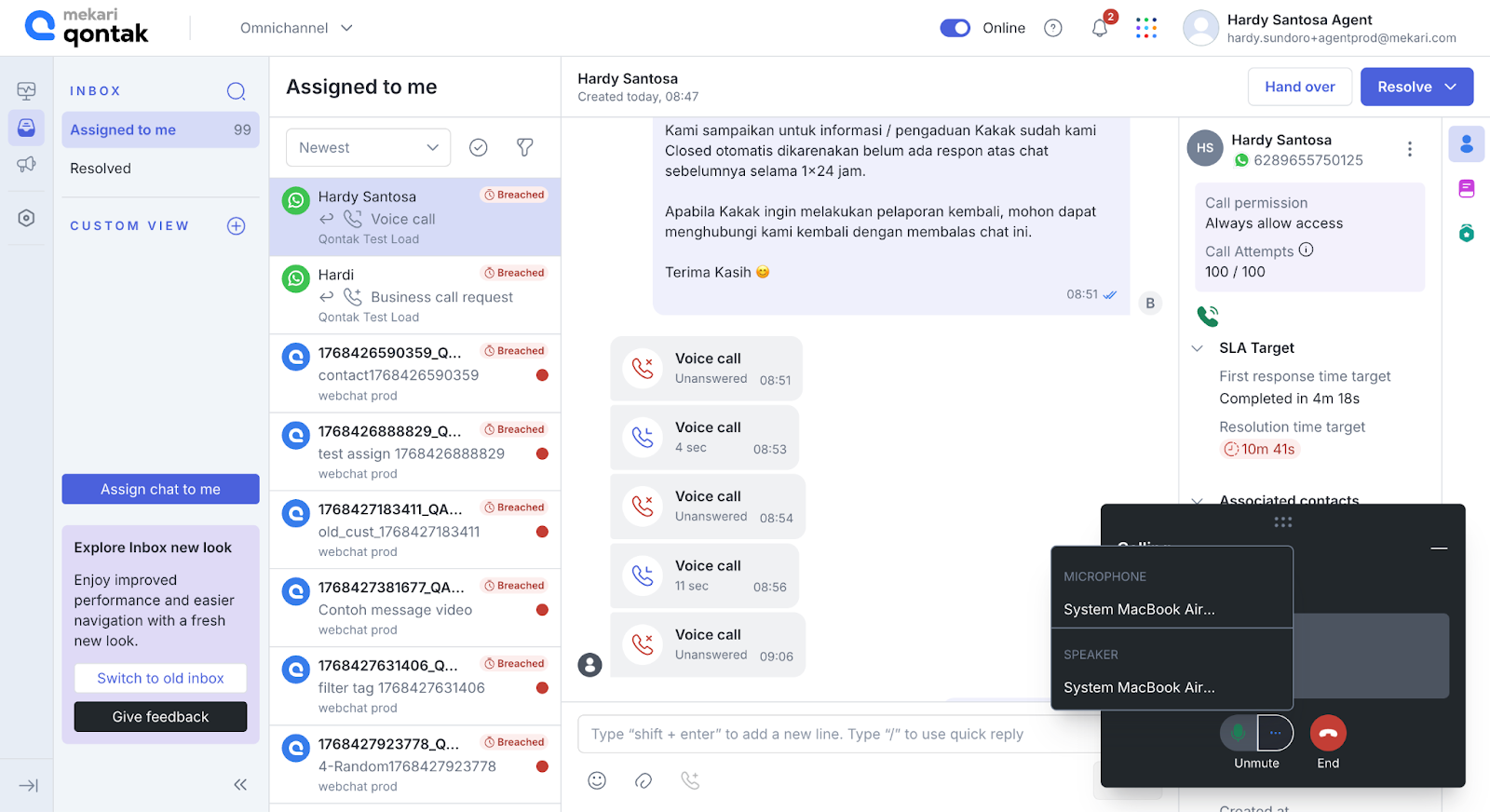 Untuk dapat menerima inbound call ataupun melakukan outbound call, pastikan perangkat baik itu laptop, PC, ataupun mobile phone sudah terkoneksi dengan speaker dan microphone. Pastikan juga sudah ‘allow permission’ terutama di browser laptop atau PC agar bisa menerima inbound call.