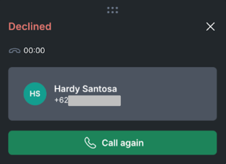 - Selain itu, Anda juga dapat memindahkan posisi widget call, dengan klik ikon titik enam berikut. - Berikut adalah tampilan apabila panggilan tidak terjawab.