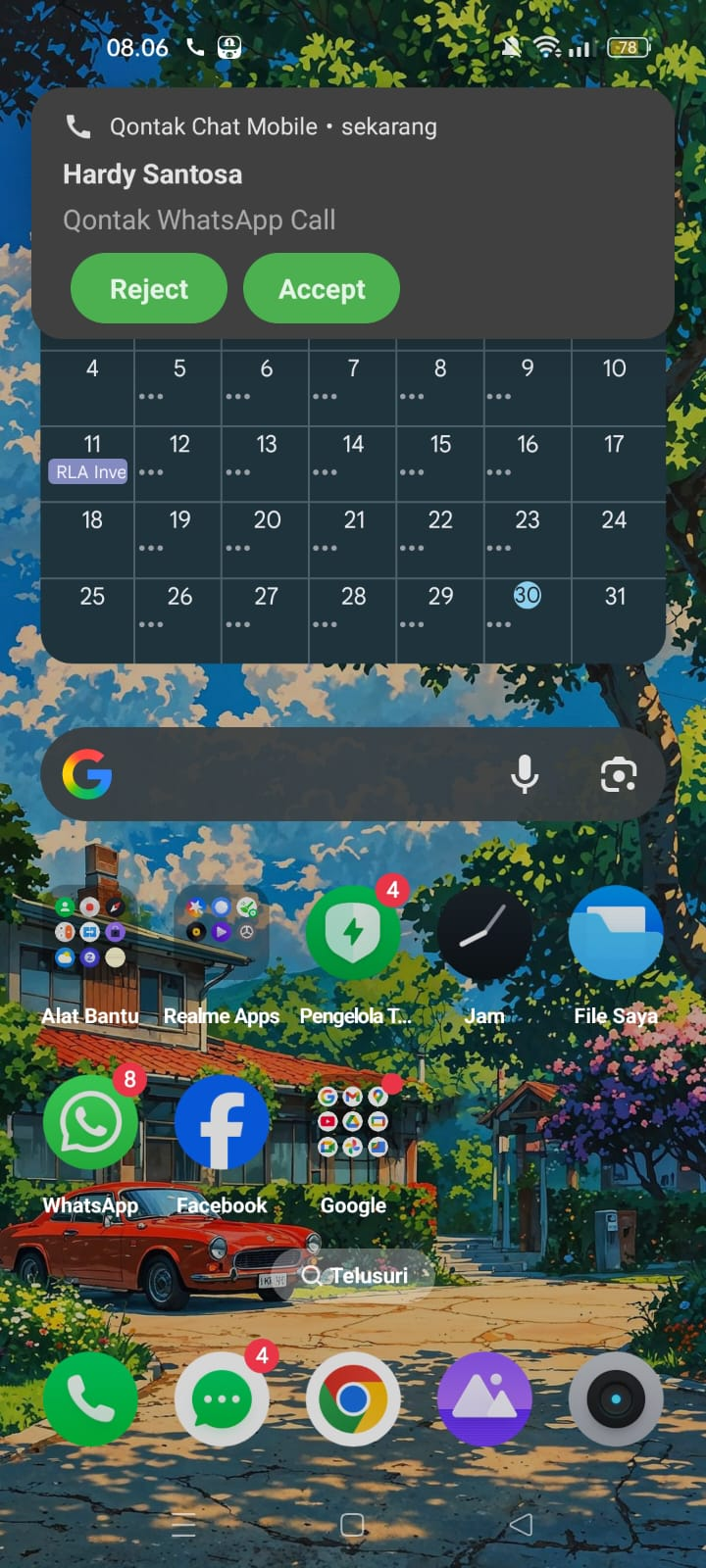 Ketika aplikasi Qontak Chat tidak aktif (ditutup) dan kondisi handphone sedang lock screen maka call widget panggilan akan muncul seperti yang terlihat pada gambar di atas. |