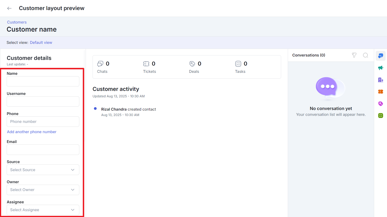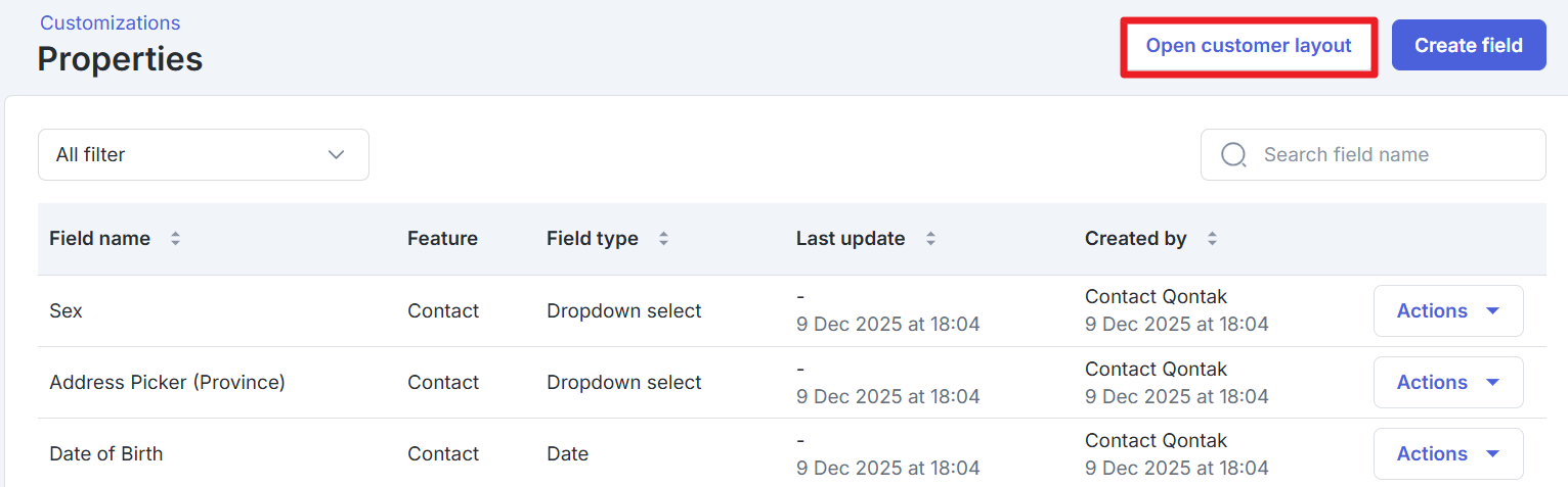 Layout Default View hanya menampilkan field yang dibuat secara otomatis oleh sistem (field bawaan dari Qontak). Field tambahan yang dibuat oleh pengguna perlu ditambahkan secara manual ke dalam layout.