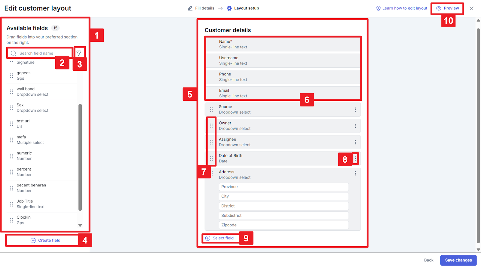 | 1 | Available fields | Berisikan fields yang tersedia dan belum ditambahkan ke area layout. Untuk menambahkan field baru, Anda dapat memindahkannya secara otomatis dengan cara drag and drop pada ikon ‘titik enam’ ke area layout. |