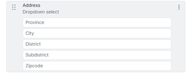 Area untuk menyusun field yang sudah ditambahkan. Sebagai informasi, tampilan field Address sudah terdiri dari kolom Province, City, District, Subdistrict, dan Zipcode. |