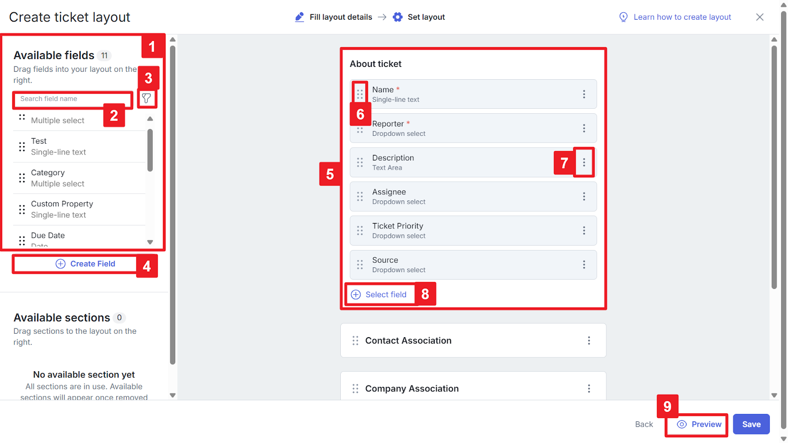 | 1 | Available fields | Berisikan fields yang tersedia dan belum ditambahkan ke area layout. Untuk menambahkan field baru, Anda dapat memindahkannya secara otomatis dengan cara drag and drop pada ikon ‘titik enam’ ke area layout. |
