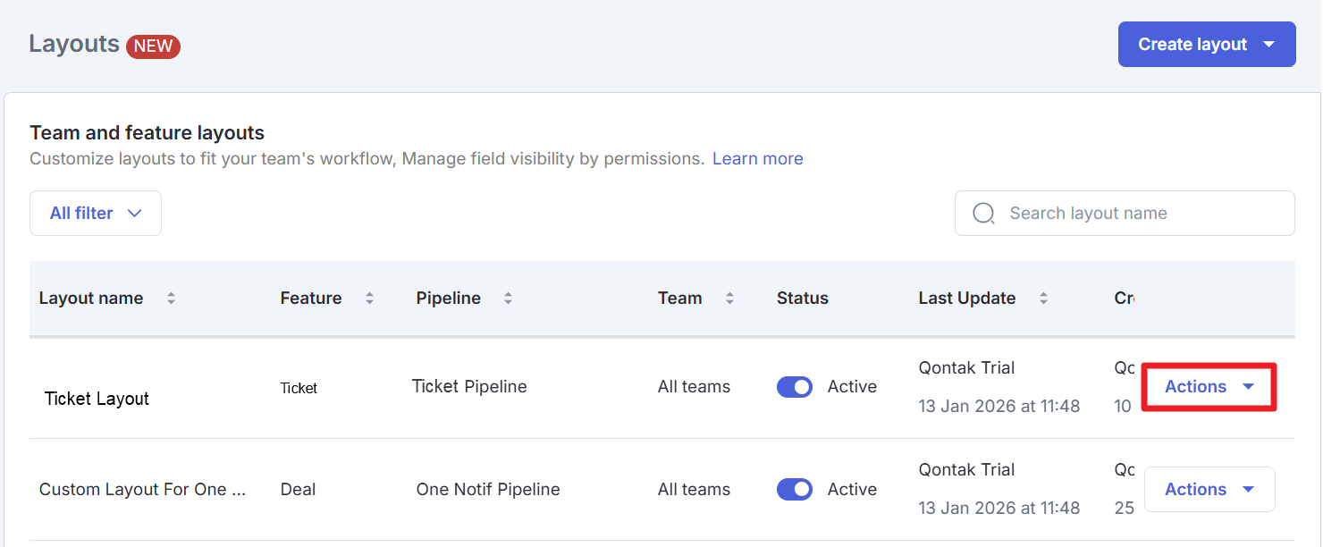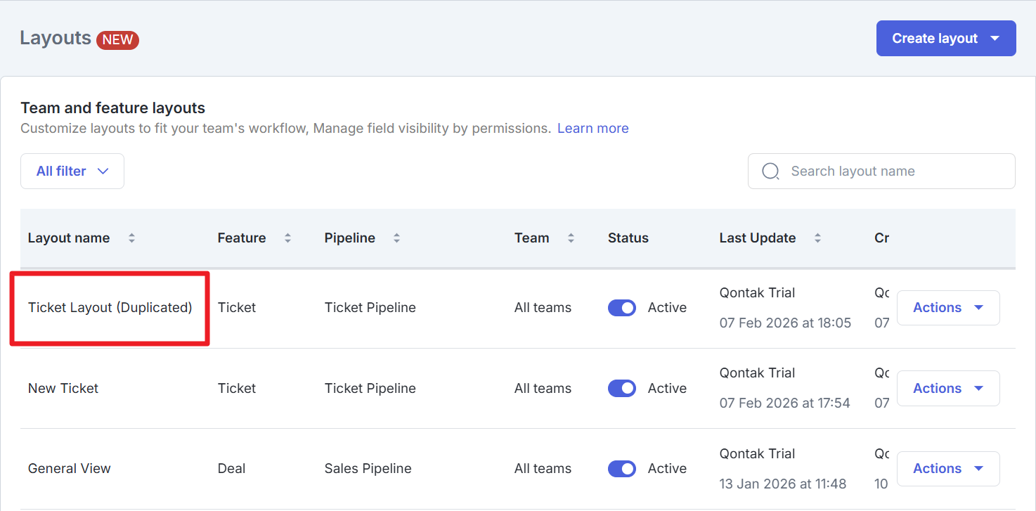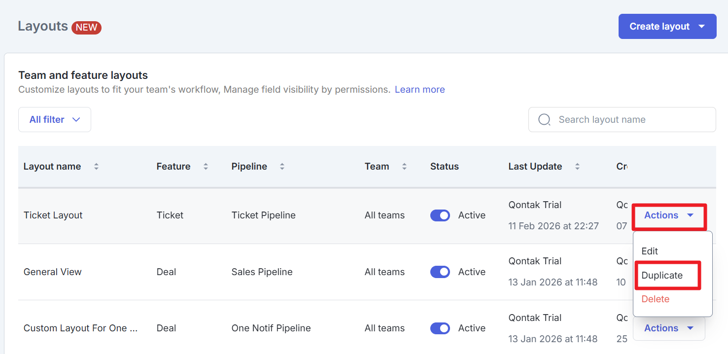 - Klik “Actions” pada salah satu Layout, lalu pilih Duplicate.