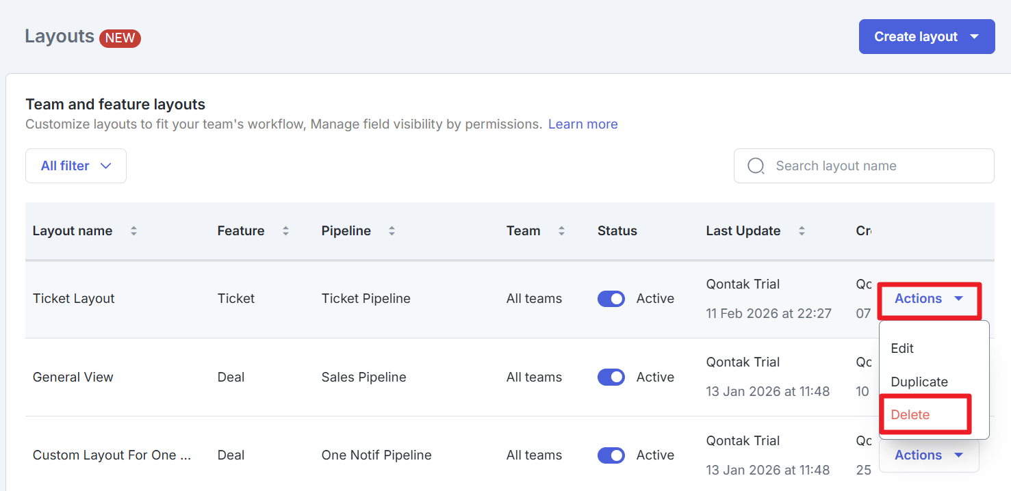 - Pada data Layout yang akan Anda hapus, klik “Actions”.