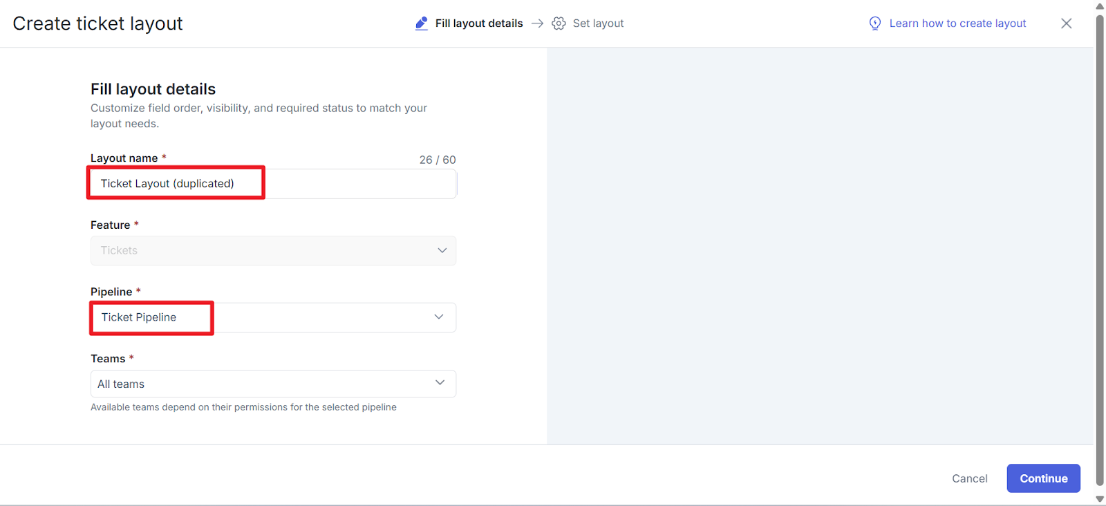 Selanjutnya Anda akan diarahkan ke halaman Create ticket Layout. Dalam hal ini, Pipeline tidak boleh memiliki Layout name yang sama dengan yang diduplikasi. Jadi, Anda perlu mengubah Layout name yang akan diduplikasi. Kemudian ulangi langkah yang sama dalam pembuatan Ticket Layout dengan menentukan Pipeline dan Team. Lalu klik “Continue”.