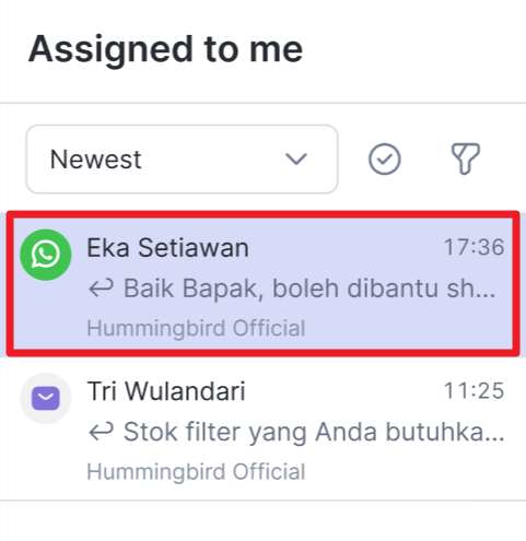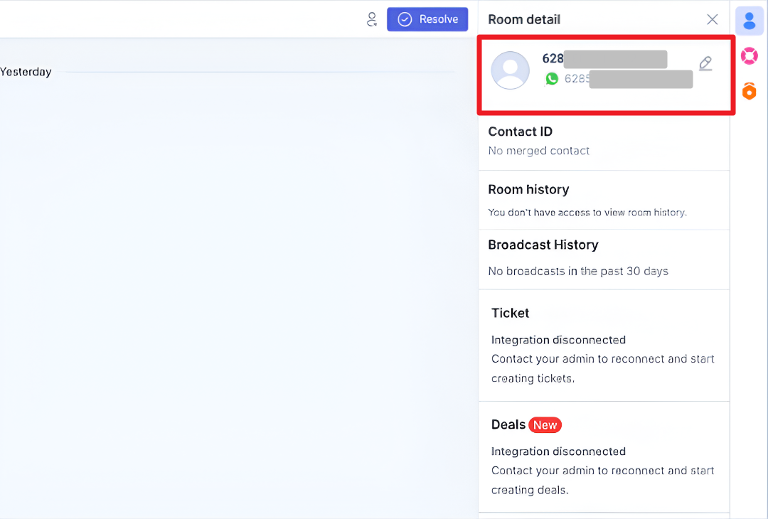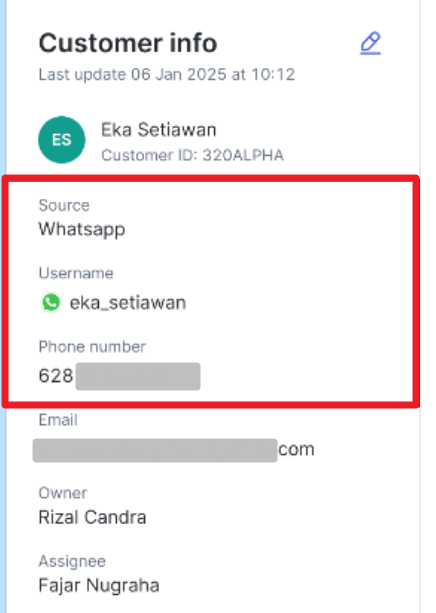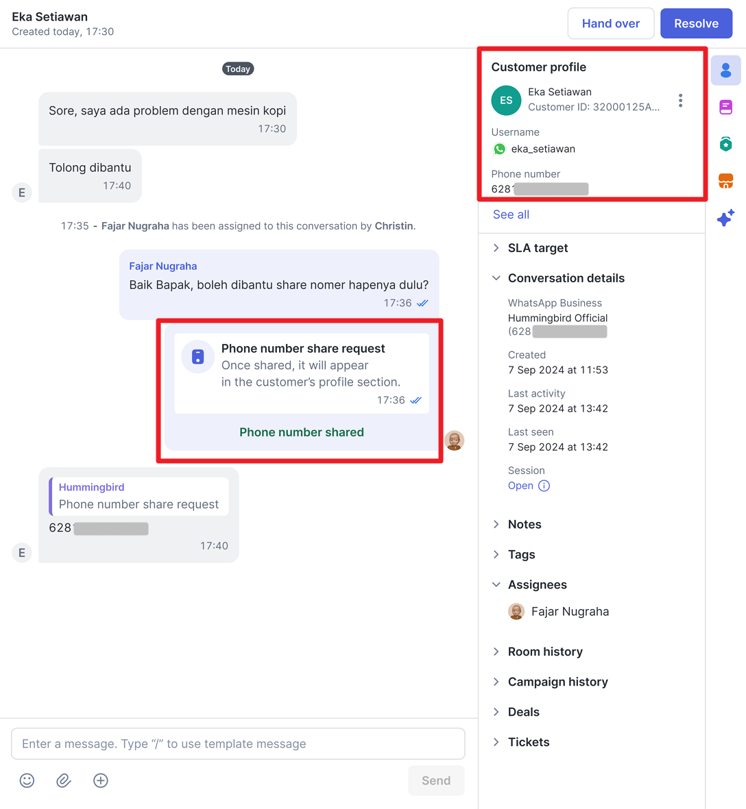 Apabila customer menyetujui permintaan berbagi nomor telepon, maka nomor telepon akan ditampilkan pada halaman Inbox seperti pada tampilan berikut.