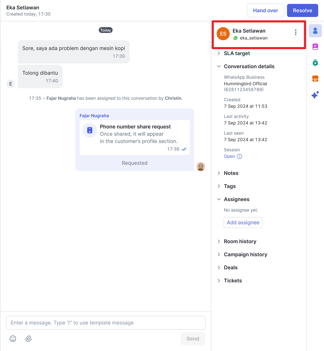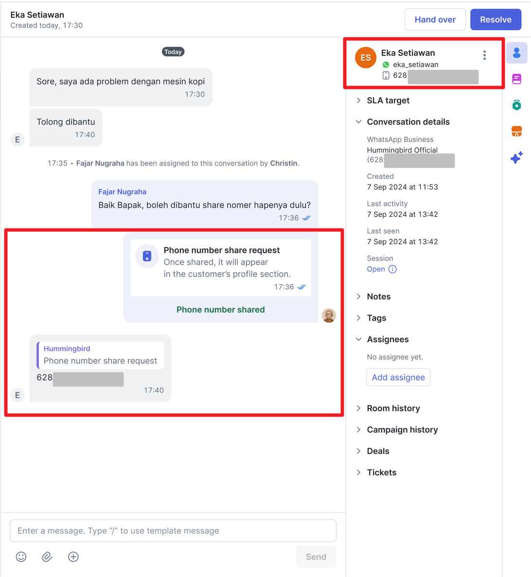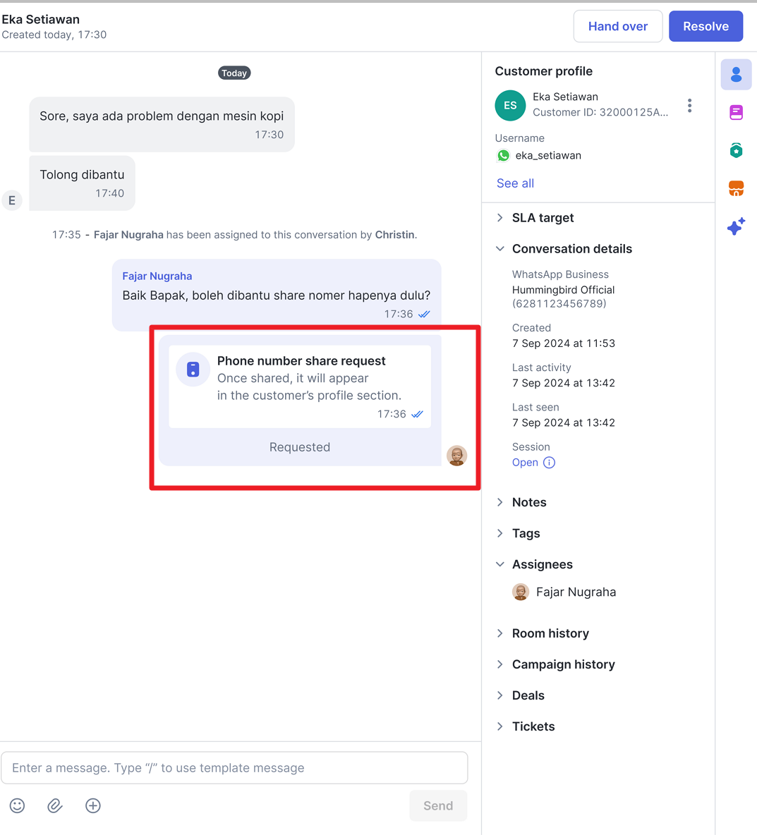 Kemudian, permintaan berbagi nomor telepon berhasil dikirim dan akan ditampilkan pada kolom percakapan dengan status Requested. Selanjutnya, silakan menunggu respon dari customer Anda.