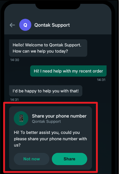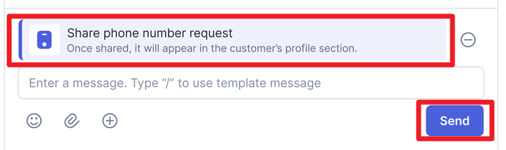 Maka sistem akan menampilkan permintaan berbagi nomor telepon pada kolom percakapan. Klik “Send” untuk melanjutkan.