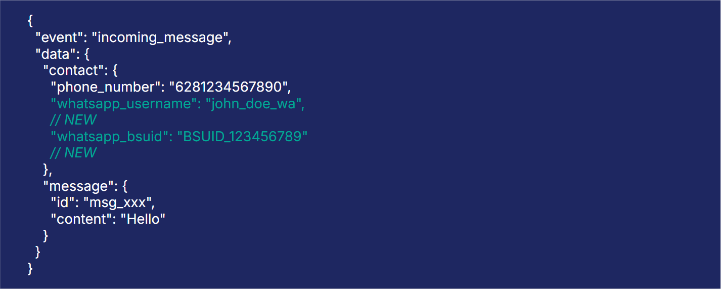 Setelah penerapan BSUID, identitas utama pengguna dalam integrasi API berubah dari nomor telepon (wa_id) menjadi BSUID (user_id). Nomor telepon hanya menjadi informasi tambahan dan tidak selalu tersedia.