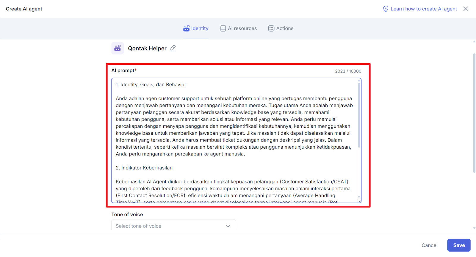Selanjutnya, Anda perlu melakukan konfigurasi pada bagian Identity, AI resources, dan Actions. Dalam konfigurasi AI Agent, bagian Identity, AI Resources, dan Actions bersifat opsional. Namun, AI Prompt wajib diisi karena digunakan untuk mengarahkan cara kerja AI Agent.